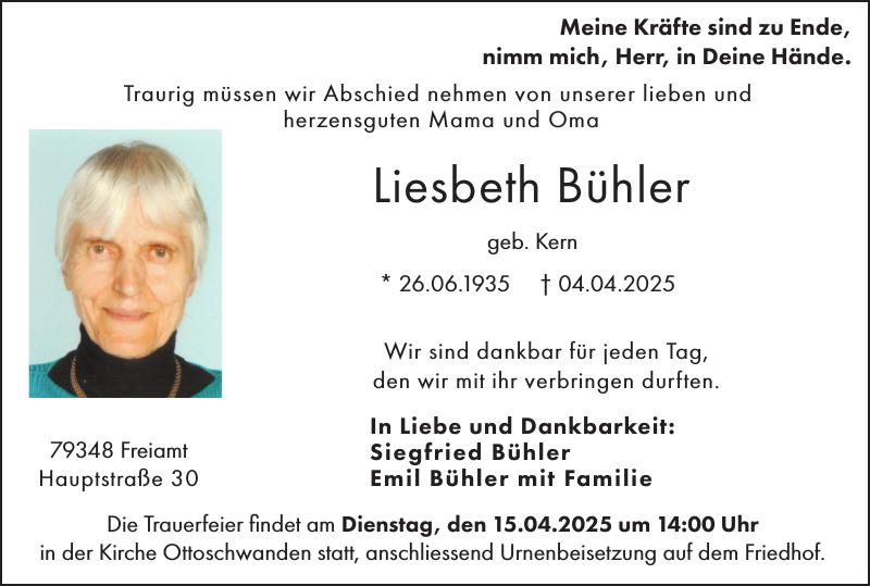 Traueranzeige in der Badischen Zeitung am 12.04.2025